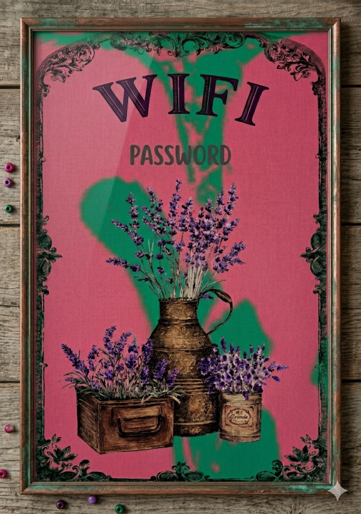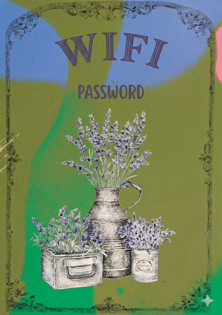 Este diseño, que incluye ilustraciones de lavanda y texturas de lino, no solo comunica la contraseña del WiFi, sino que refuerza esa sensación de calma y naturaleza que buscan quienes escapan de la ciudad.